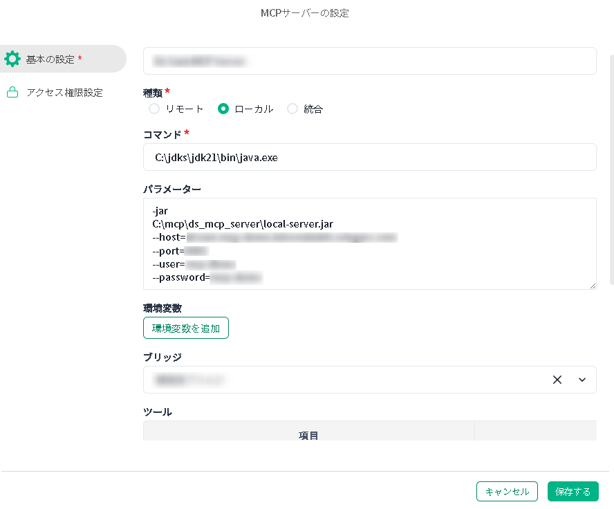 | コマンド | ローカルMCPサーバーを立ち上げるためのコマンドを入力します。 | 任意 |