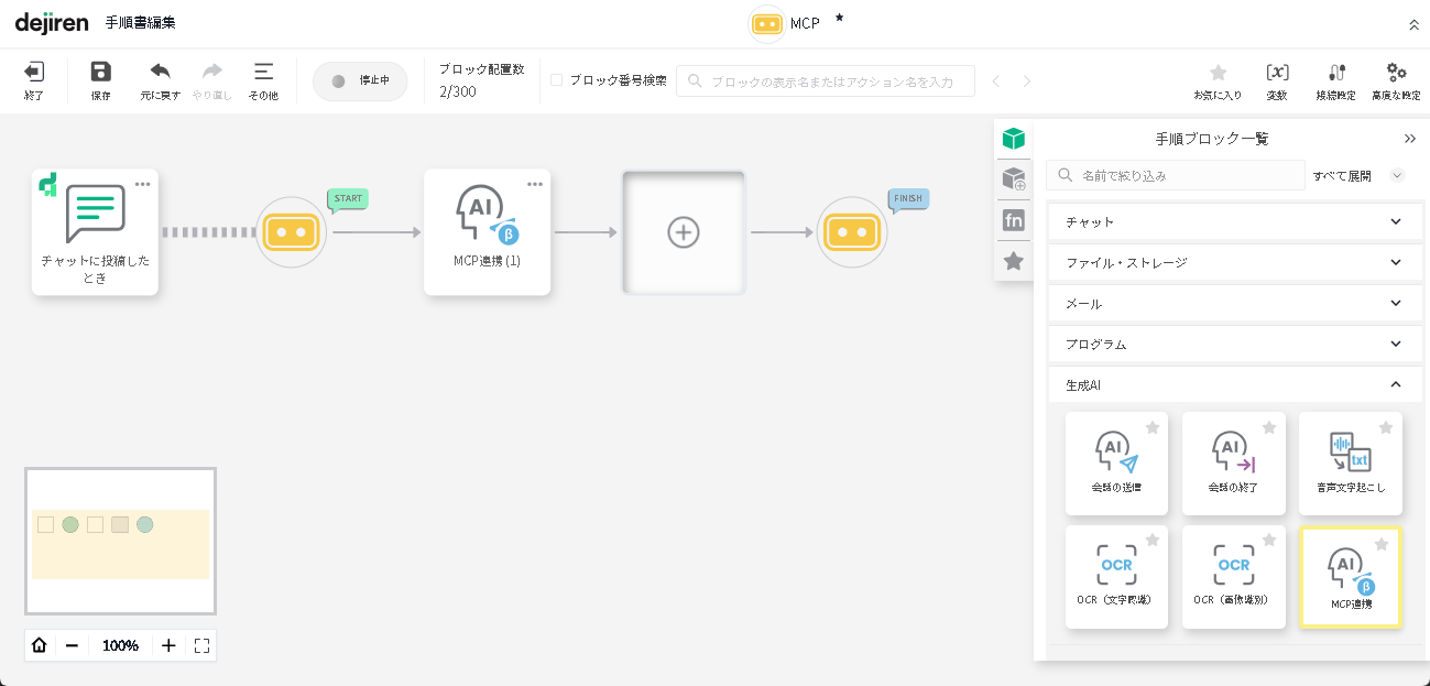 手順ブロックの「手順ブロック一覧」-「生成AI」にある「MCP連携」ブロックを使用します。