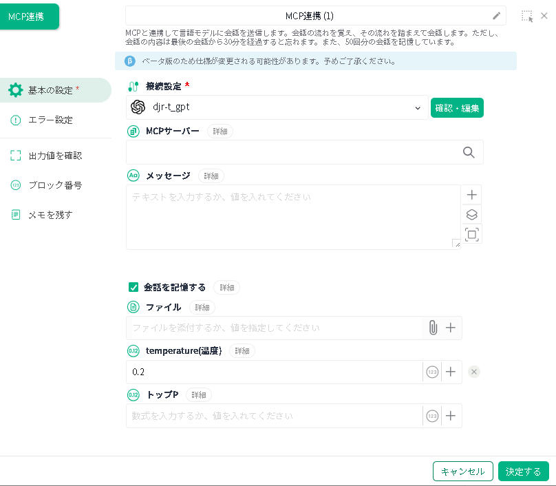| MCPサーバー | 上記手順で作成済みの MCP サーバー設定を選択します。 | 必須 |