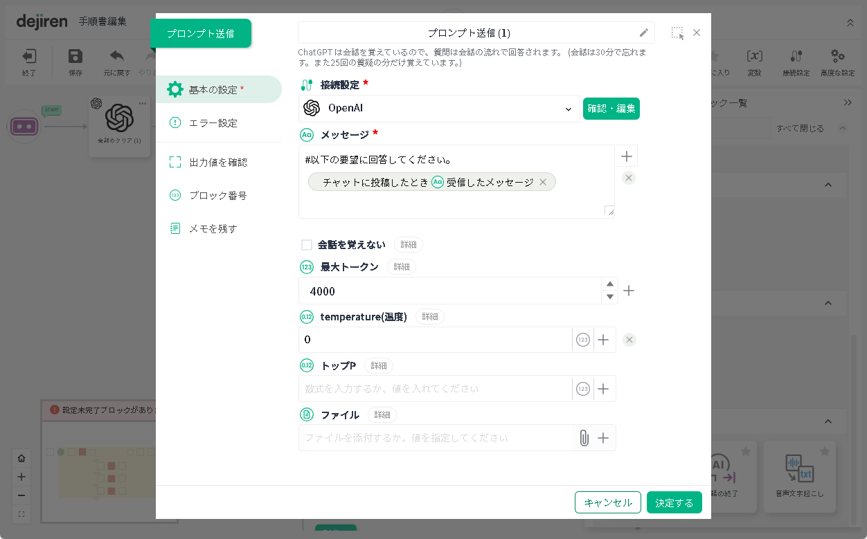 注意点として、各生成AI個別の手順ブロックを使用する場合には、[dejiren AI]の接続設定はご利用いただけません。各ユーザー企業・団体様にて個別にご契約の各生成AIサービスのアカウントをご利用いただく必要があり、弊社提供プランとは別に費用が発生します。