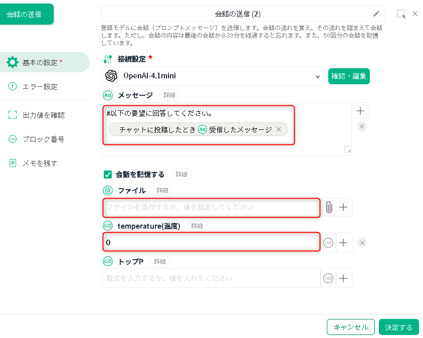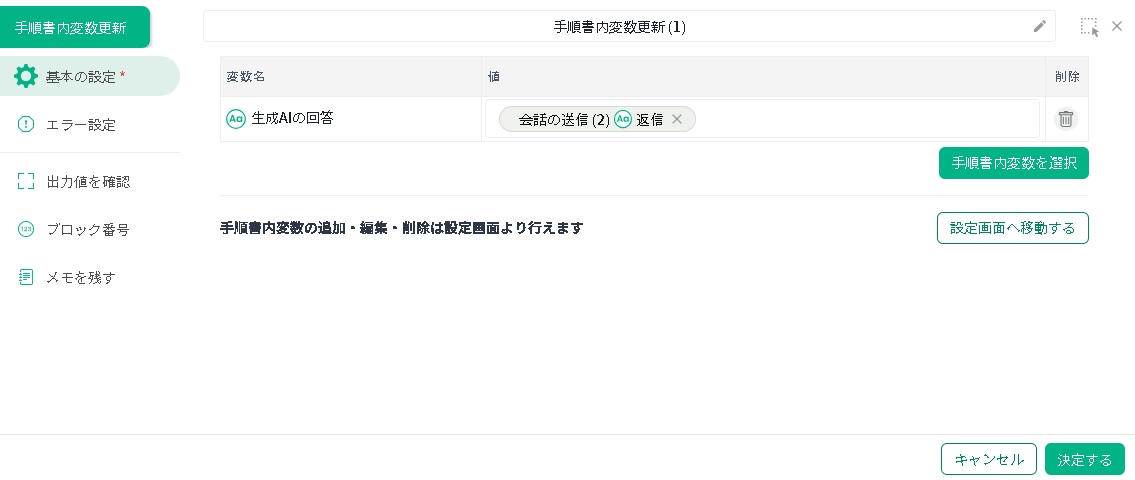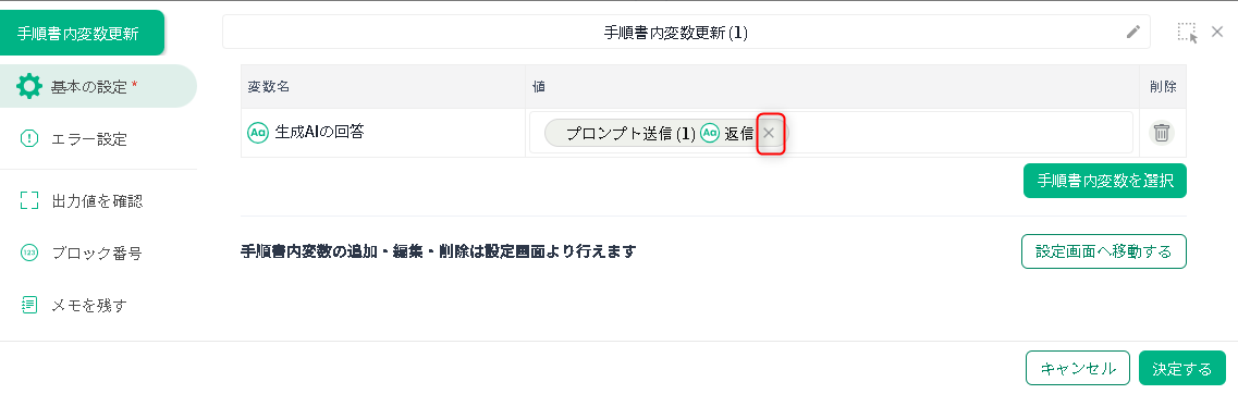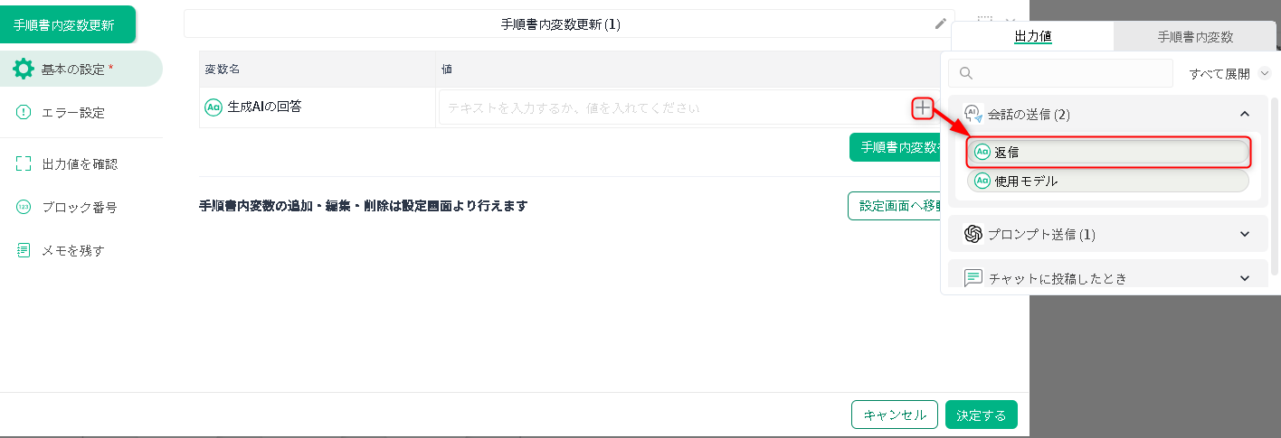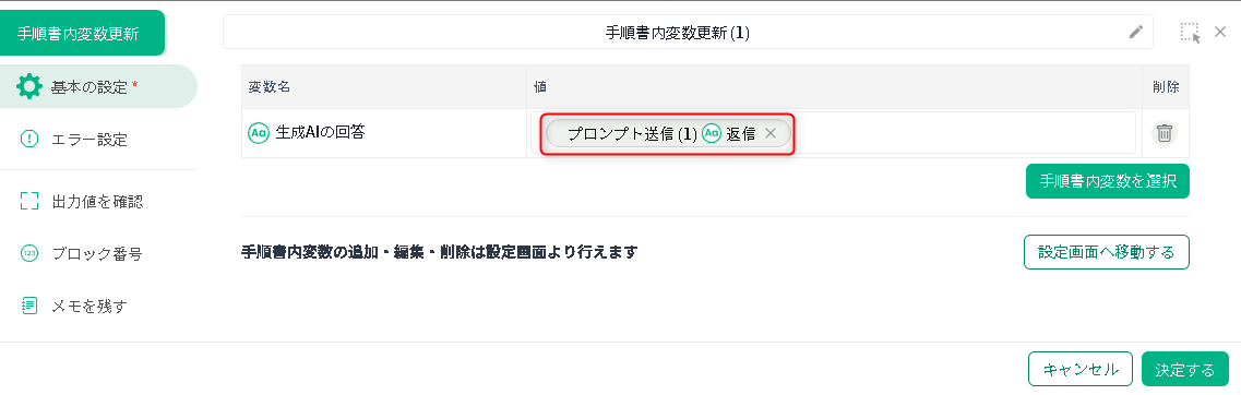 6. 生成 AI 関連ブロックの出力値を用いる手順ブロックの設定を差し替えます。