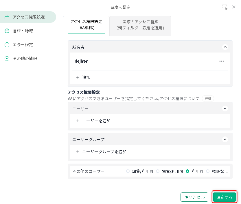 VA を編集されるユーザーやテストユーザーの方に限定してください。