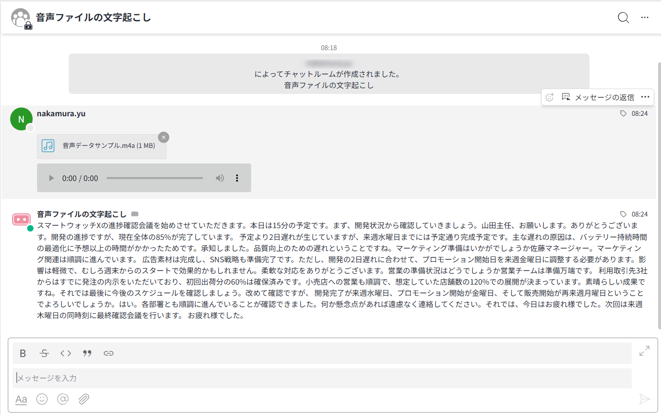 ① 音声ファイルを添付してチャットメッセージを投稿すると