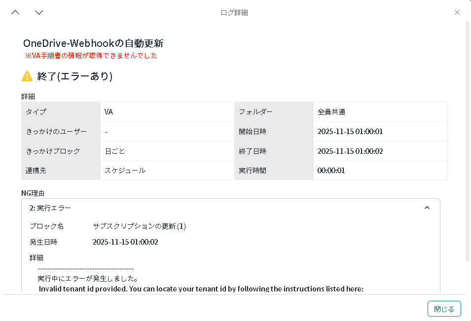 [操作]列の[…]から、各VAの詳細実行ログ、エラー内容の表示やVA手順書編集の別画面での表示も可能です。