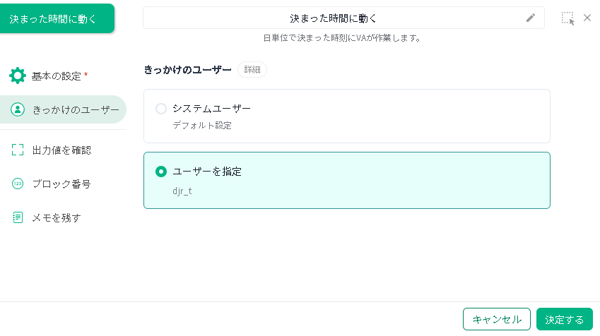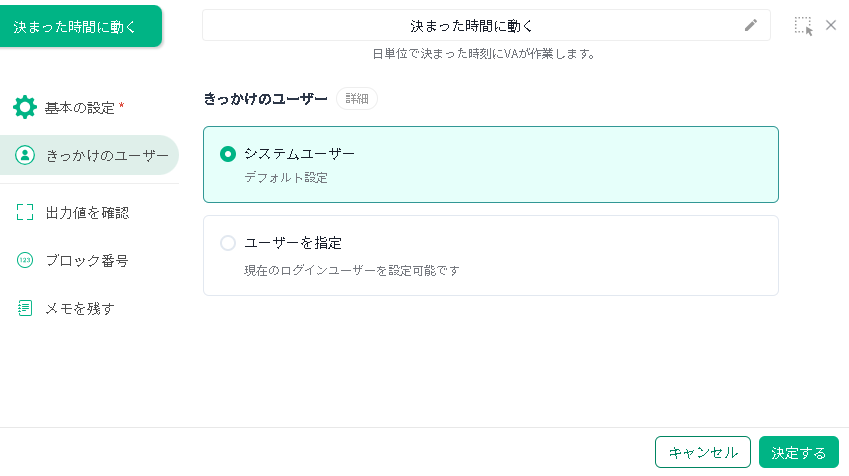 ◆ VAが動作するきっかけを「メールが届いたとき」、「ファイルに変更があったとき」、「決まった時間に働く」のいずれかにした場合、初期状態では、動作のきっかけのユーザーはシステムユーザーです。