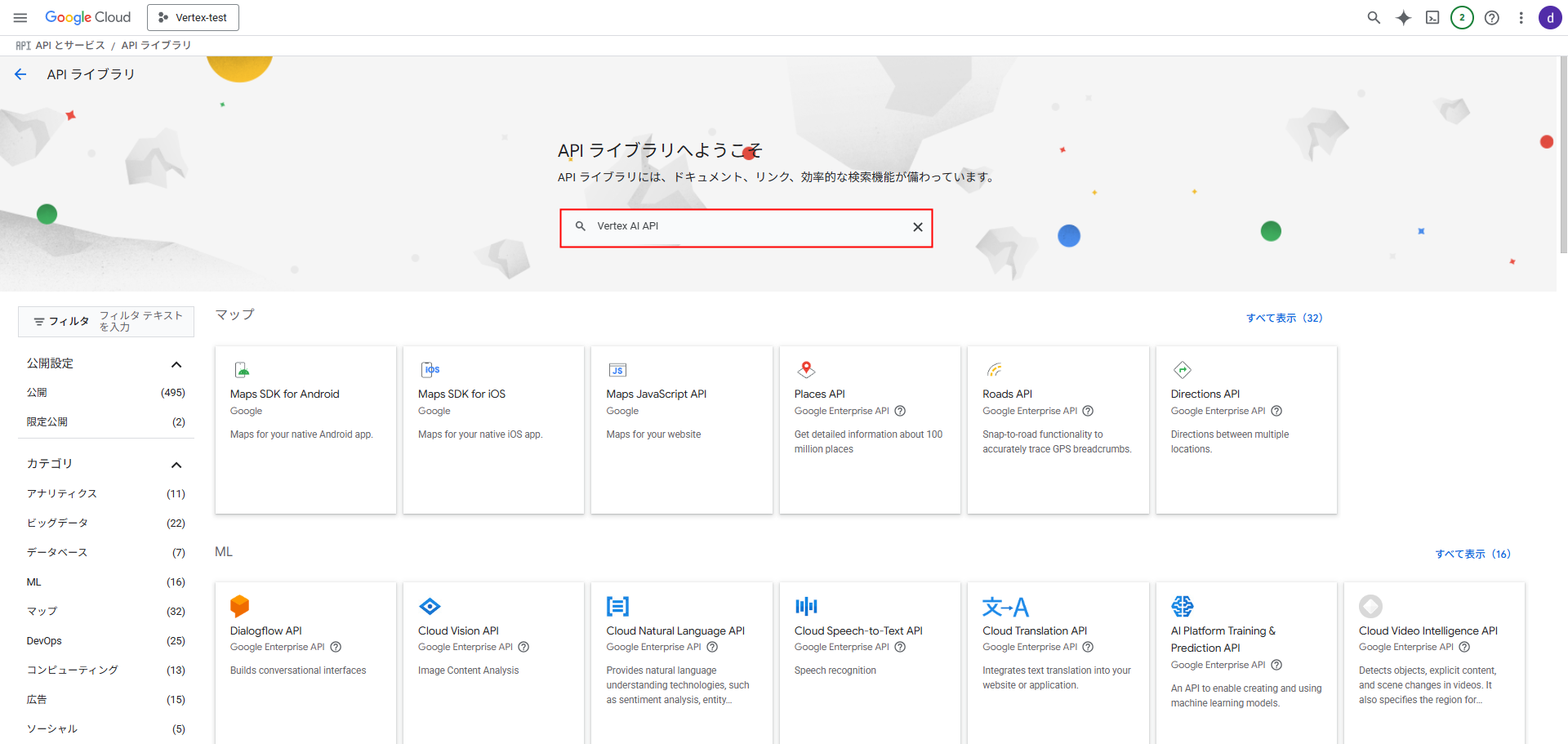 3. 検索窓に [Vertex AI API] と入力して検索を行います。