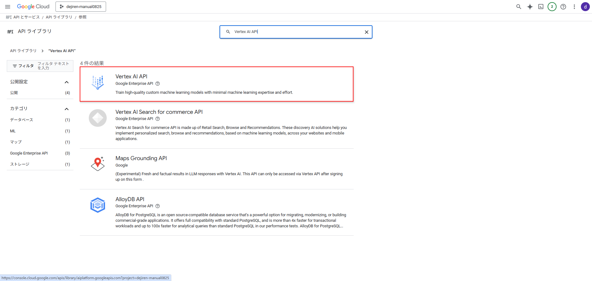 4. 検索結果に表示された Vertex AI API をクリックします。