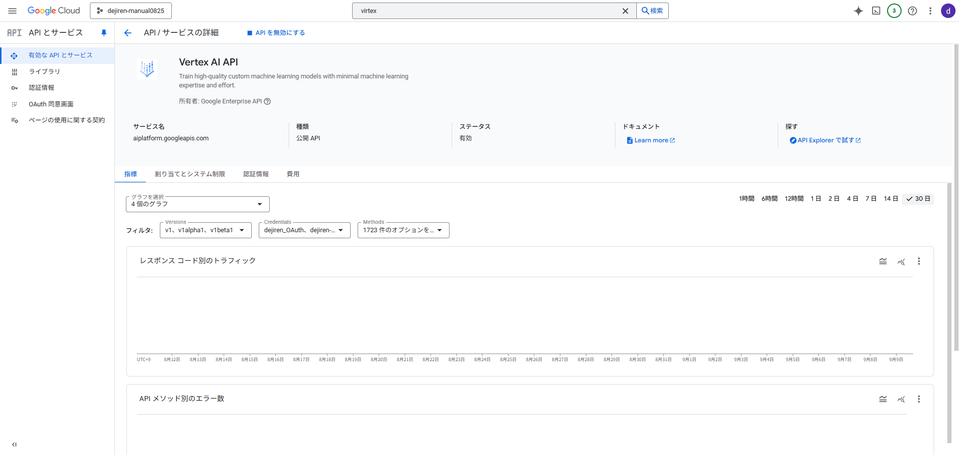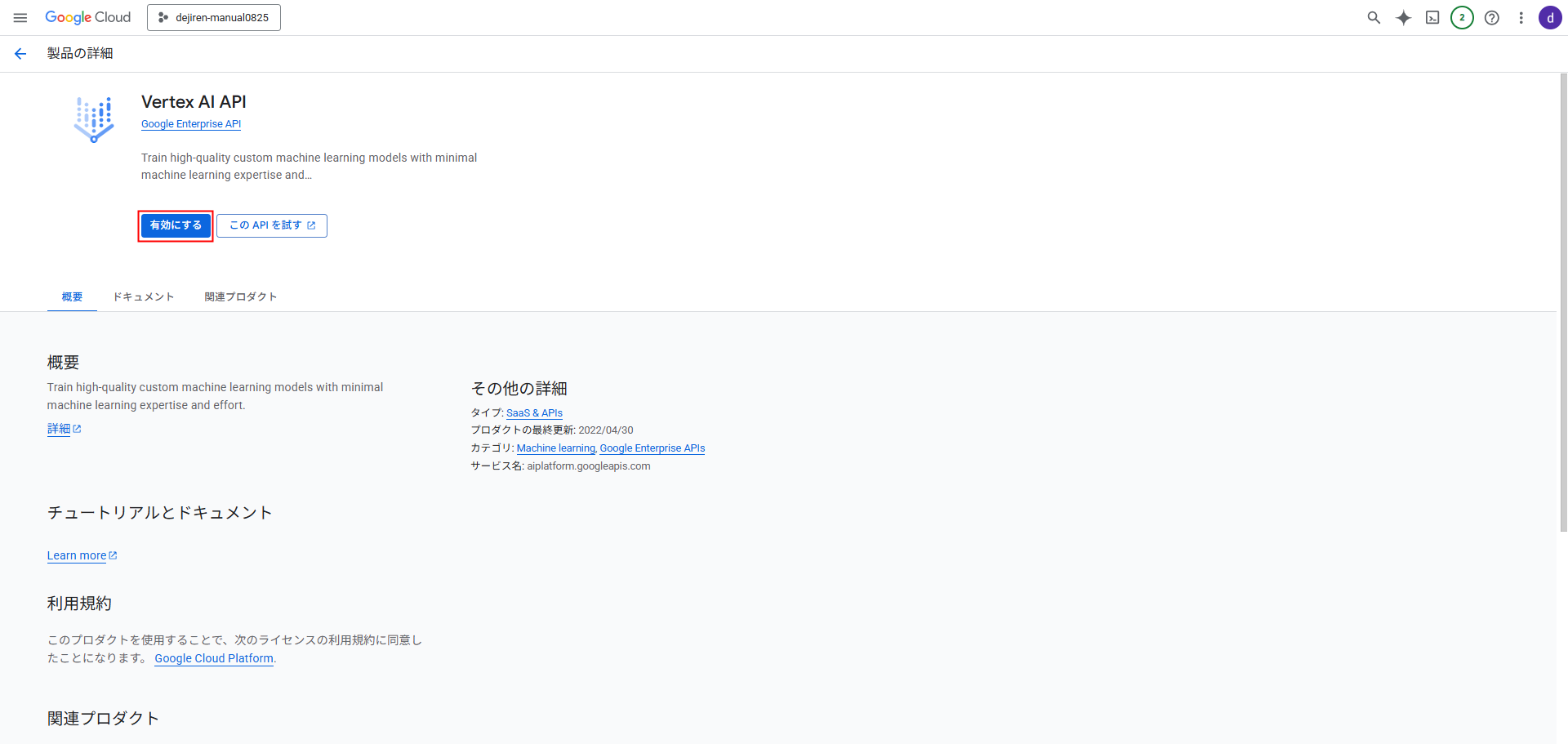 6. Vertex AI API の詳細画面が表示されると API の有効化は完了です。