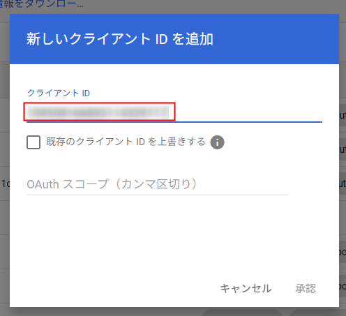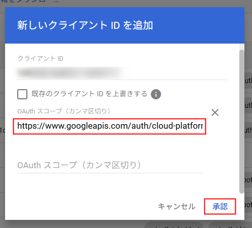 5. [OAuthスコープ]に以下のカンマ区切りテキストをコピーして貼り付け、[承認]をクリックします。
