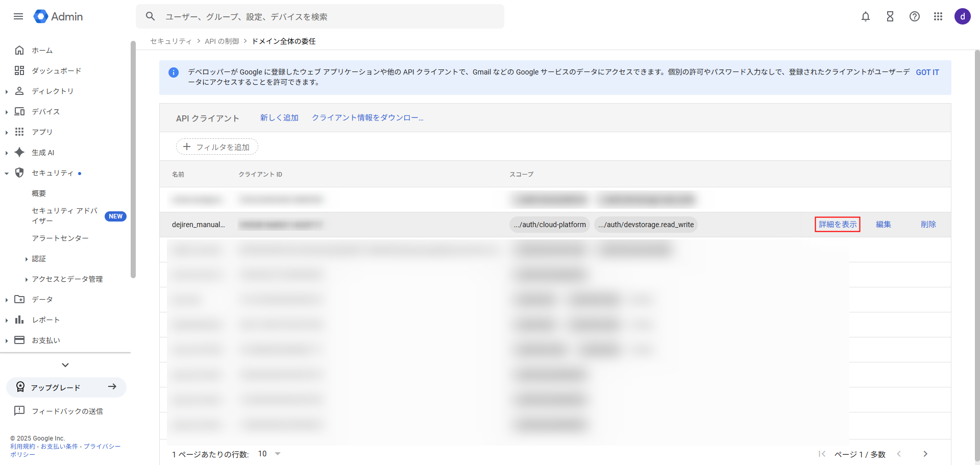 6. API クライアントの一覧にアクセス権を設定したサービスアカウントが追加されるので、[詳細を表示]をクリックします。