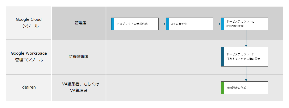 Google Cloud コンソール | 管理者 | プロジェクトの作成 OAuth同意画面の作成 APIの有効化 サービスアカウントの作成 OAuthクライアントの作成 |