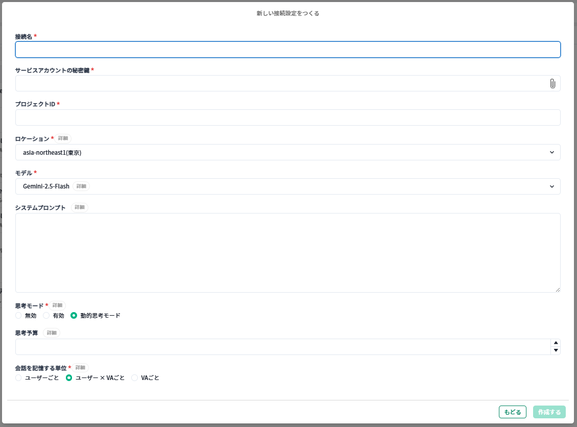 | 思考モード ※詳細はこちら | 無効:思考モードを使用しません 有効:[思考予算]で設定した値を上限として、思考モードを使用します 動的思考モード:生成AIが自動的にタスクに応じた上限を設定し、思考モードを使用します |